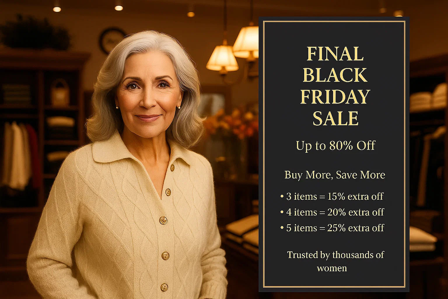 Ladies after 30 wonderful years, this will be my final Black Friday Sale due to illness I simply can no longer carry on — lets make this sale one to remember by Enjoying 80% OFF everything until all stock is gone.